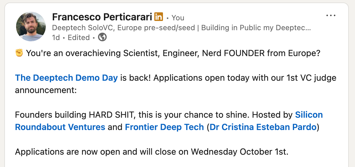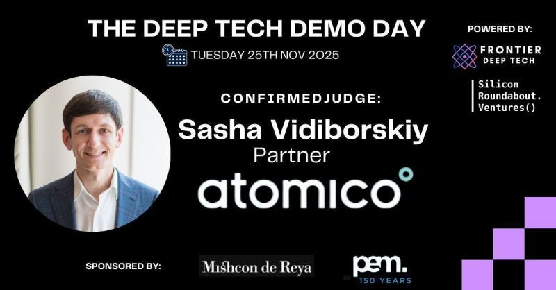 📅 Alpha Summit in London on 4 September with the fund nominated; Silicon Roundabout Ventures FO/Exited Founder Dinner in Turin on 1 October with Riccardo Zacconi; Deeptech Demo Day on 25 November with applications open and 60+ VCs confirmed.